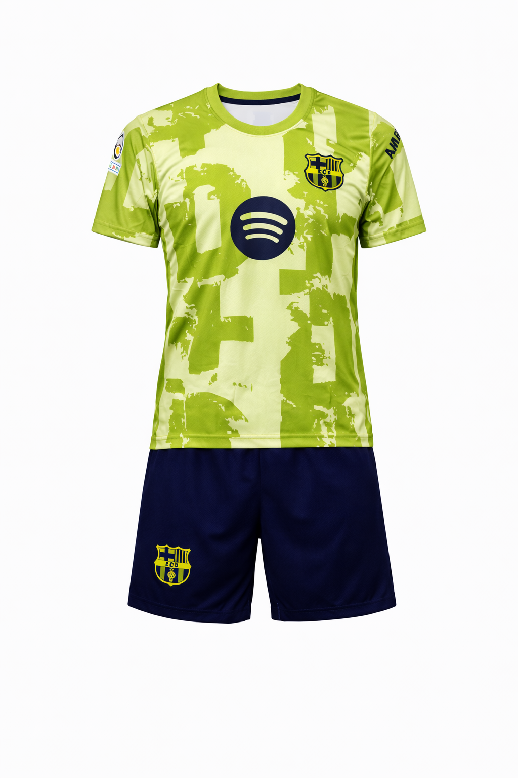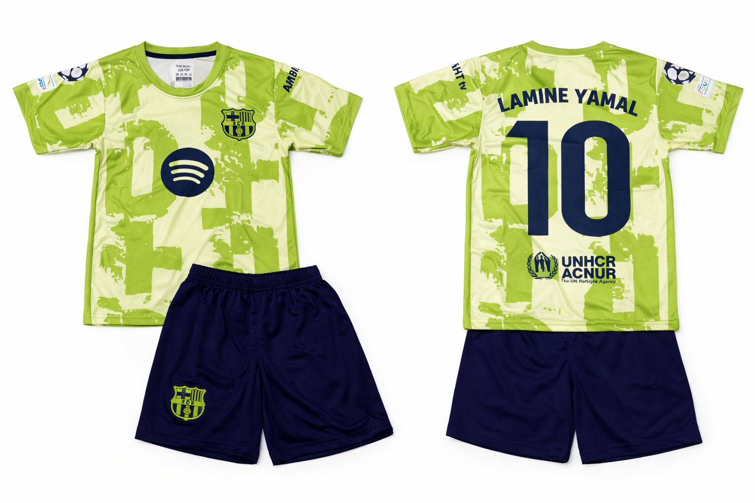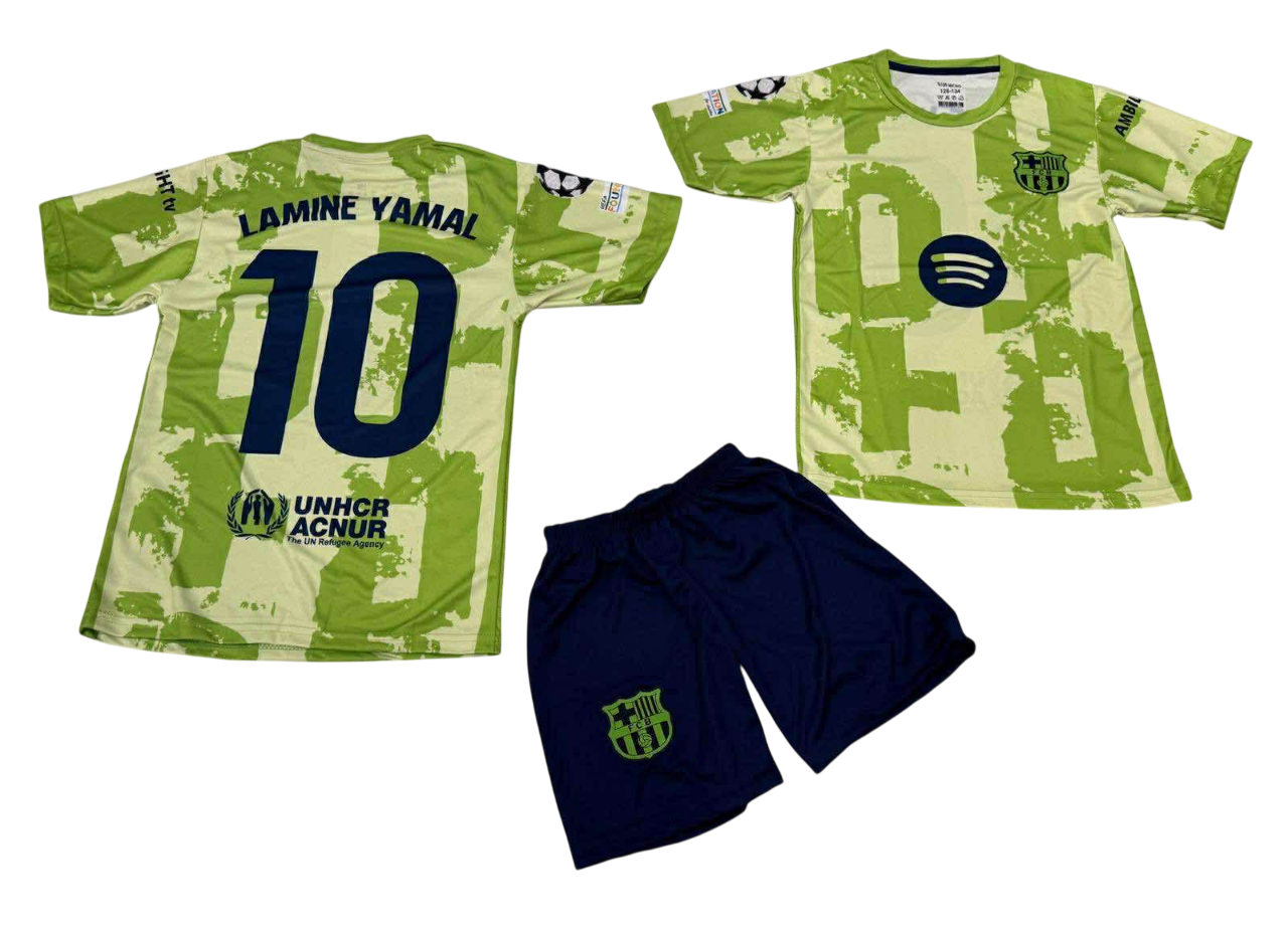 Σετ Εμφάνισης Barcelona με φανέλα και σορτσάκι Lamine Yamal με το νούμερο 10 σε πράσινο χρώμα με μαύρο σορτσάκι . Διαθέτει τεχνολογία υφάσματος που απωθεί τον ιδρώτα , ανάγλυφο σχέδιο και ραμμένο σήμα .